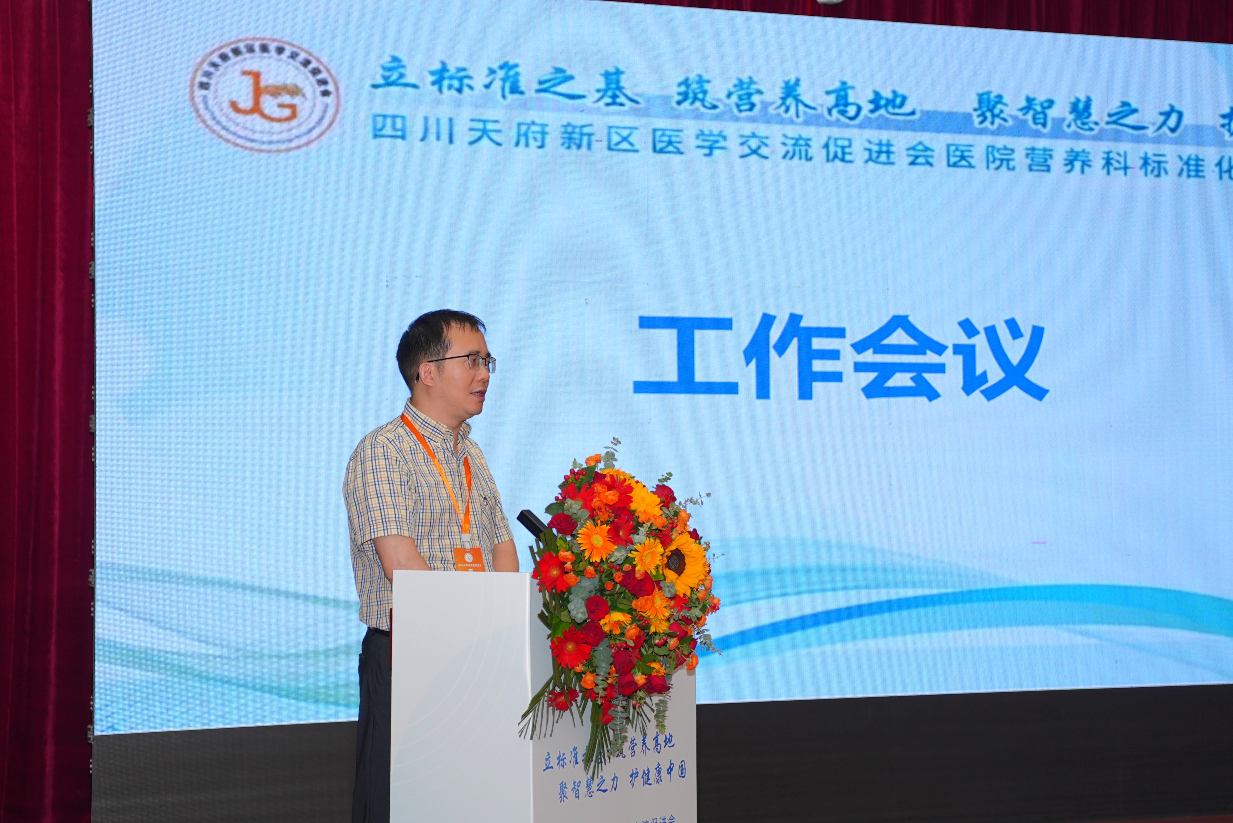 四川天府新区医学交流促进会李跃军秘书长致开幕辞。他向全体参会人员表示欢迎,并表示四川天府新区医学交流促进会将全力支持专委会的工作,为专委会开展学术研究、标准制定、人才培训等活动提供必要的保障与服务。期待专委会能够以今天的成立为起点,秉持“专业、规范、创新、共享”的理念,积极履行职责,主动担当作为:一是要立足临床需求,推动营养科建设标准的落地见效;二是要加强学术交流,促进前沿技术与经验的推广应用;三是要强化人才梯队建设,为学科发展注入持久动力;四是要深化医研协同,助力营养科研成果的转化与实践。相信在各位专家的引领下,在全体委员的共同努力下,本专委会必将成为推动我省医院营养学科高质量发展的重要力量,为保障人民群众健康作出新的更大贡献!